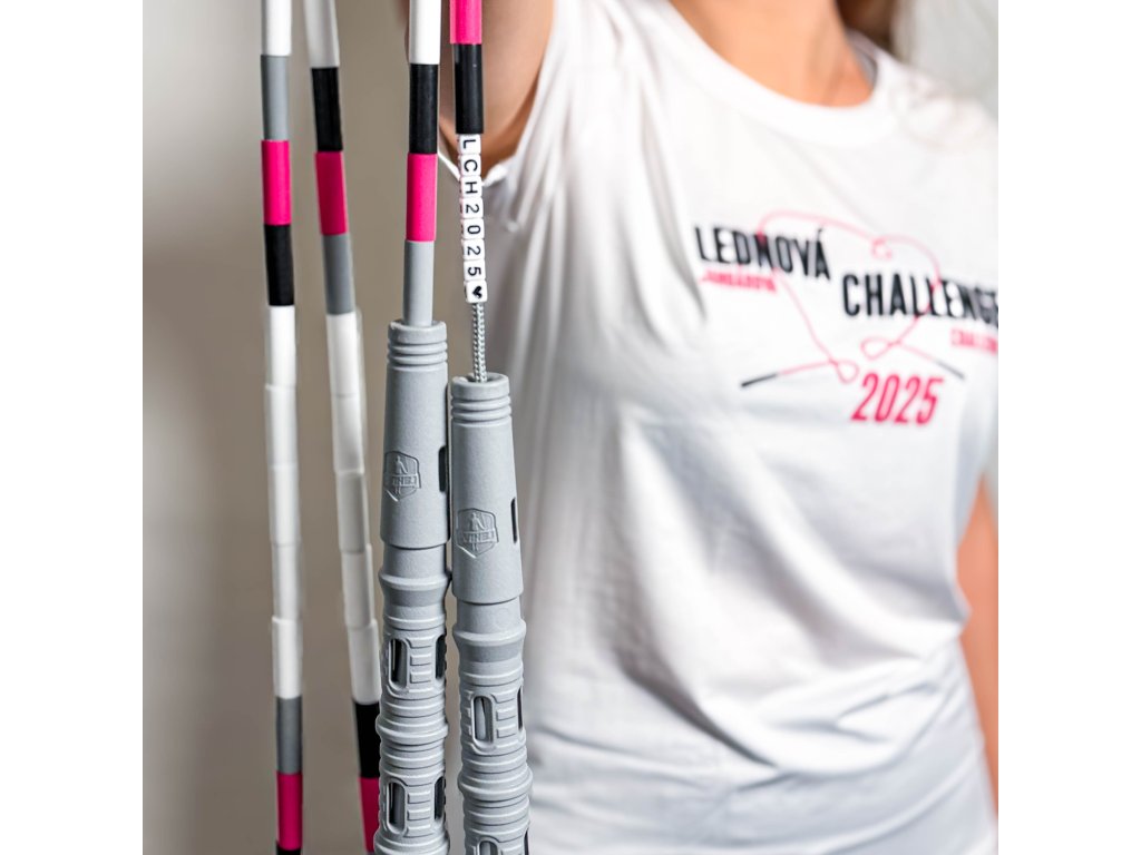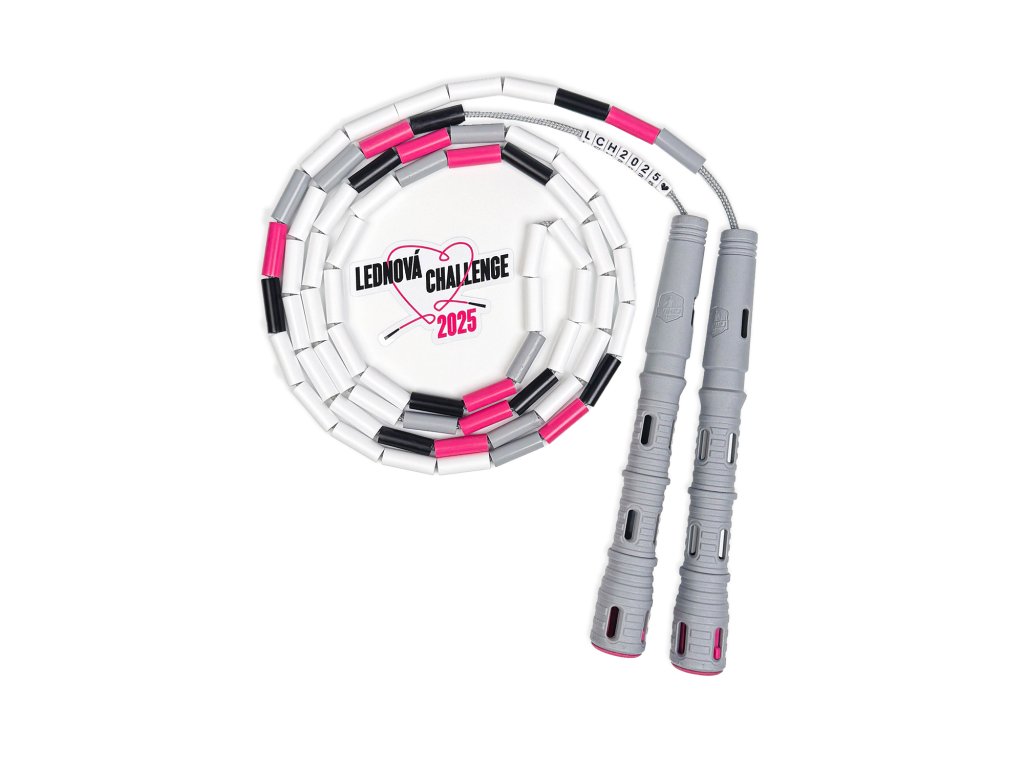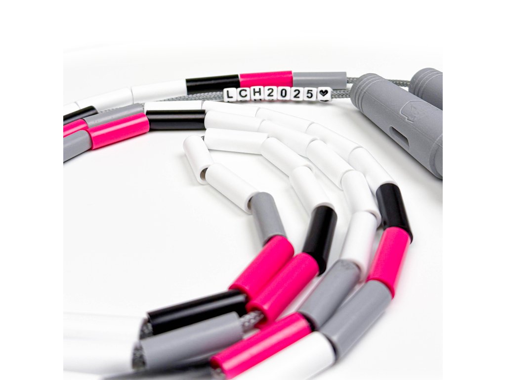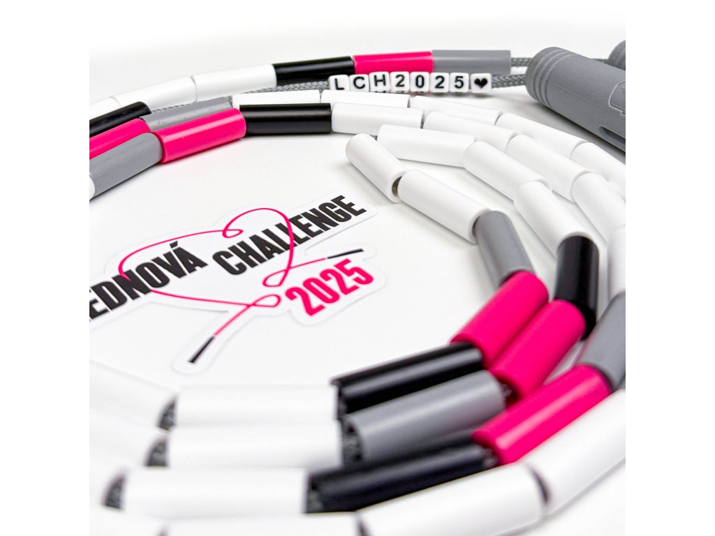 Koráliky reprezentujú farby Januárovej challenge 2025 - ružová, sivá a čierna, no prevládajúcou farbou je biela. Na každom švihadle sa po sebe opakuje 5 bielych korálikov. Tie predstavujú 5 detí, pre ktoré celý január všetci budeme švihať. Navyše na unikátnom sivom lanku nájdeš špeciálne koráliky so skratkou LCH2025, aby si mal na túto výzvu spomienku.